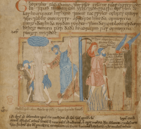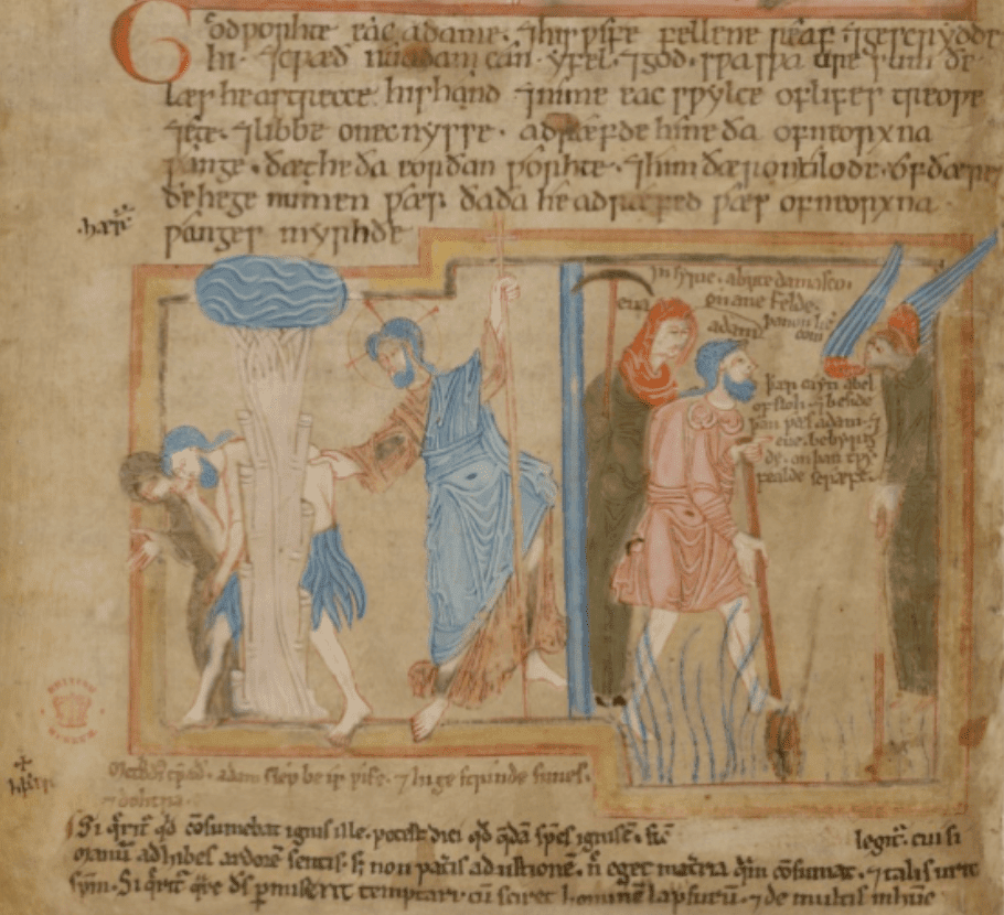 Adam and Eve hiding from God; the Expulsion; Adam and Eve laboring, from an Old English Hexateuch, around 1000 AD, British Library, Cotton Claudius B. iv, f.7v