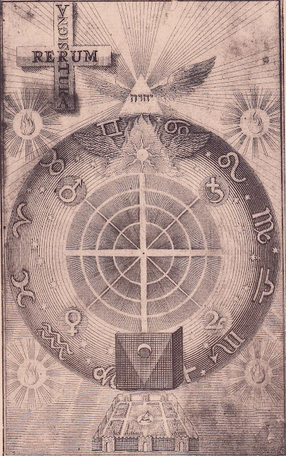 And Jesuit "Christian" Athanasius Kircher with a bunch of esoteric symbols - including old friends the compasses. The armillary sphere is held by an angel, certifying the validity of the knowledge of the heavens. Here too, the astrological knowledge opens a cloudy window to the divine. The Hebrew lettering indicates that this is specifically the God of the Old Testament. The Christian God.