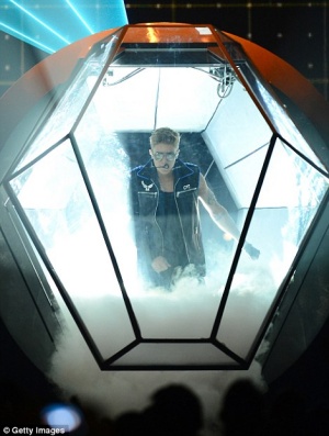 In the MailOnline article's lengthy title we're let in on one of the highlights, “Justin Bieber emerges from an alien orb.” This alien orb was modeled on a chariot of the Egyptian sun god, associated with Horus Behdeti. (Search this blog for Horus Behdeti and also for winged disk) Bieber's arrival from out of the winged orb modeled the return of the sun god, the arrival of the Beast.