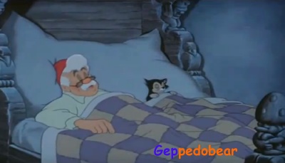 In this screenshot, Geppetto is in bed with the little black and white cat, covered by a quilt with a Masonic checkerboard pattern. Felines and their features signal Beta or sex kitten programming, which are often programmed to give support to the Delta assassin missions. Pedobear. GepPedobear. Disney named Geppetto's cat, Figaro. This a name that has been used in theatrical productions for many years, and it has come to mean, “an adroit and unscrupulous intriguer.” This name certainly is an apt description of the Beta-Delta operative. The cat in Puss in Boots named Kitty Softpaws was another animation character fitting the exact description. Note, cats are commonly kept by witches as familiars.