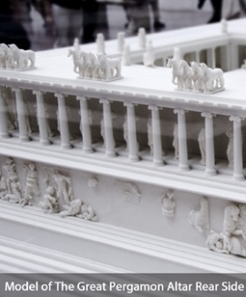 The horses on the flanking columns strengthen the association. The other poster from the Berlin Olympics of 1936 picked up the horses and rooftop of the Eastern face (See image on right - "rear side") of the Pergamon temple. Yet, the stylized version isn't an exact match. The raised center section suggests the Zeppelintribüne version, which Speer built on a larger scale. Nuremberg's Zeppelintribüne was in use at the time of the 1936 Olympics in Berlin, but still under construction.