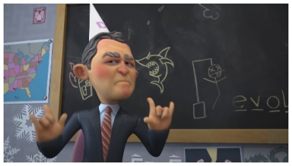 If the implication by omission in Bush's expression is too subtle a clue, the numeral 2 is displayed while he's struggling to recall how the adage goes, right after he says “Fool me once.” We're shown a closeup of Bush's face with the obfuscated numeral appearing in the eyebrow above Bush's left eye.
