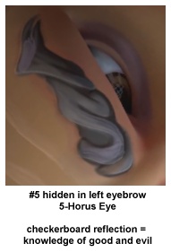 This is duplicated in picturing him with the Horus Eye. The numeral in his left eyebrow mirrors to a 2 but if you simply rotate it you see it as a 5. The 5 signals Horus (47th Problem of Euclid & 3.4.5 Pythagorean triple). Embedding a 5 in his eyebrow says Horus Eye! The Horus Eye illumination is with the knowledge of good and evil. Heliofant's symbol is elegant, and powerful. Remember, this is Satan's marionette.