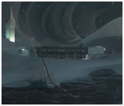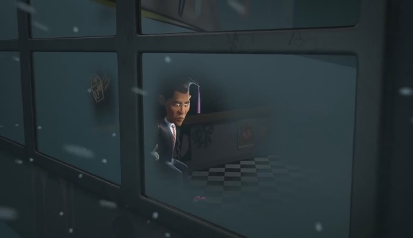 The scene set in the school is brought to a drawn out conclusion with his terrified expression maintained in our view. As the virtual camera pulls back we see Obama still looking down at the lotus at his feet, frozen in fear.