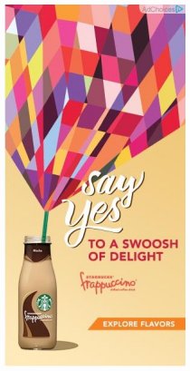 In this recent ad for Starbucks Frappuccino, they supplement their own logo's goddess imagery with a symbol of Nike, their trademark swoosh. Given the chocolate colored drink and the straw, with the rainbow colored geometrical emanation, you really have to identify this as a sign of the disgusting trauma inducing practices of consuming of bodily fluids during ritual sodomy programming.
