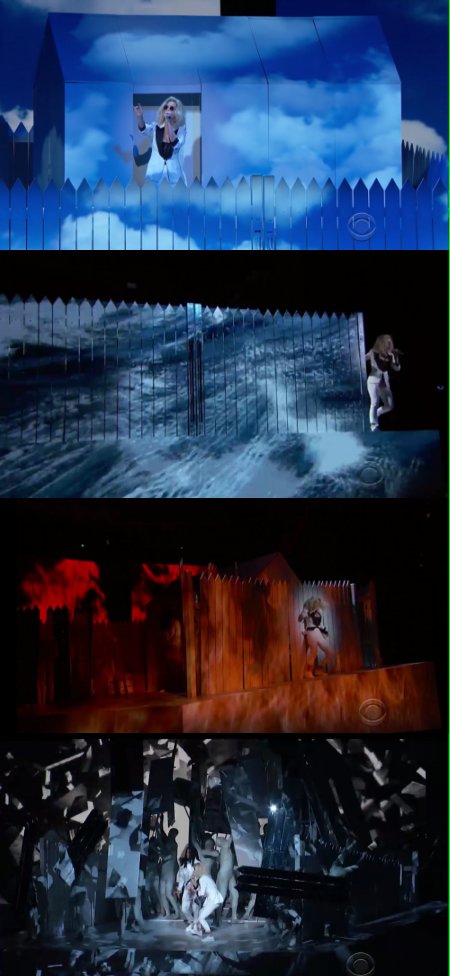 The art of the drama performed on stage was literally the casting of a spell and the 4 elements of the guardians or watchtowers were evident. The platform for the performance rotated on top of the big stage, and Katy began inside it and walked around it. She's the High Priestess. There was a picket fence around the perimiter of a kind of dwelling, in the clouds as a heavenly tabernacle. Magick circles are typically cast with regard to the squared circle and primary directions and four elements, air, fire, water and earth. This one starts as the casting of the magick circle does, with air, the clouds and the lightning storm. Instead of following the rest of the sequence they kind of NLP it, including all of them in a loosy goosy way for obfuscation, but with a strong emphasis on the water and the fire, it's pretty obvious what's going on. As you consider the scene to see how the Earth is represented, you see that it's ever present, in the fenced area.