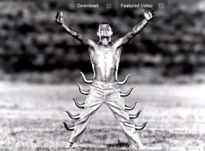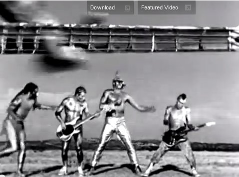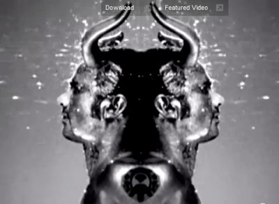 This screenshot from the video pictures a mirrored pair of images of the horned band member. There's a Monarch programming facet but this also is a celestial Silver Gate image. The horned Taurus and the Twins of Gemini, the silver painted skin: It's pretty obvious what is meant by this set.