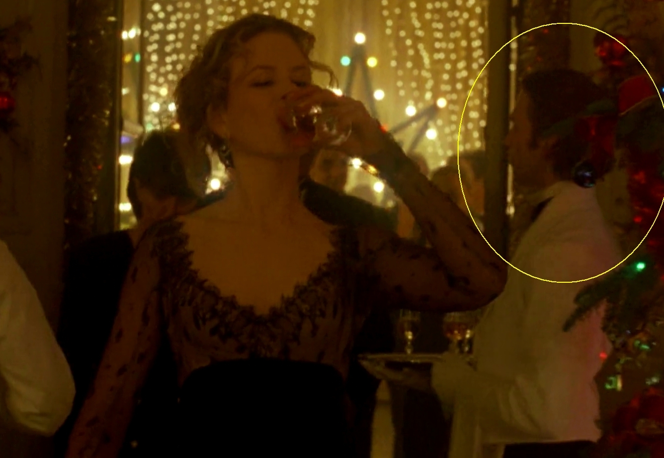 While Bill is being seduced by the two models at Ziegler's...Alice (Kidman) is concurrently being seduced by the 'wealthy' Hungarian aka Sandor Szavost. Szavost seems to have Alice under some kind of hypnotic spell (watch the scene) and it may well be a reference to Alice disassociating (mind control). This could all play into 'priming' her (alters) for the soon to follow Somerton ritual, where she's a girl in the circle. Alice is already initiated into the group who run these things, it is Bill (Cruise) who is still on the outside, at this point.